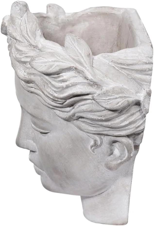 Nuestra auténtica y romántica maceta de cabeza de diosa griega tiene un acabado sintético envejecido para un efecto antiguo único de estilo y belleza. Fundido en cemento, con abertura en la parte posterior para montaje en pared. Interior y exterior.