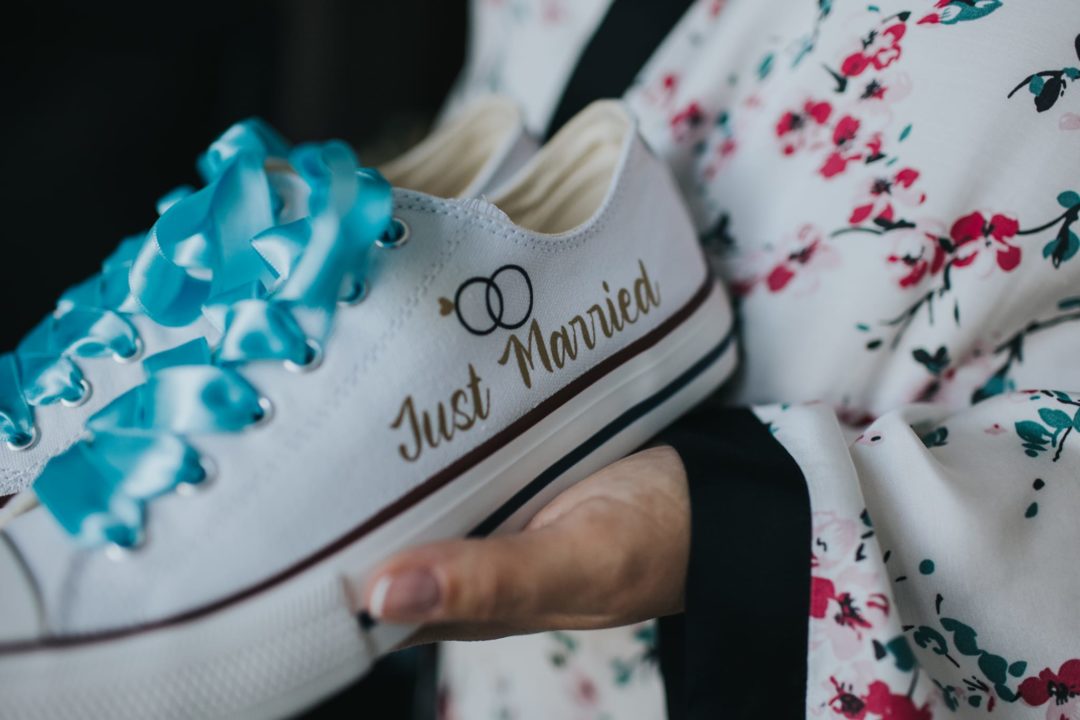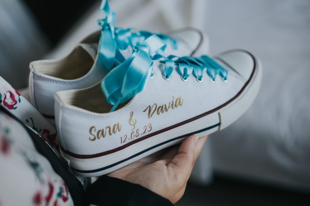 Zapatillas Victoria personalizadas con frase y los nombres de los novios y la fecha de la boda.