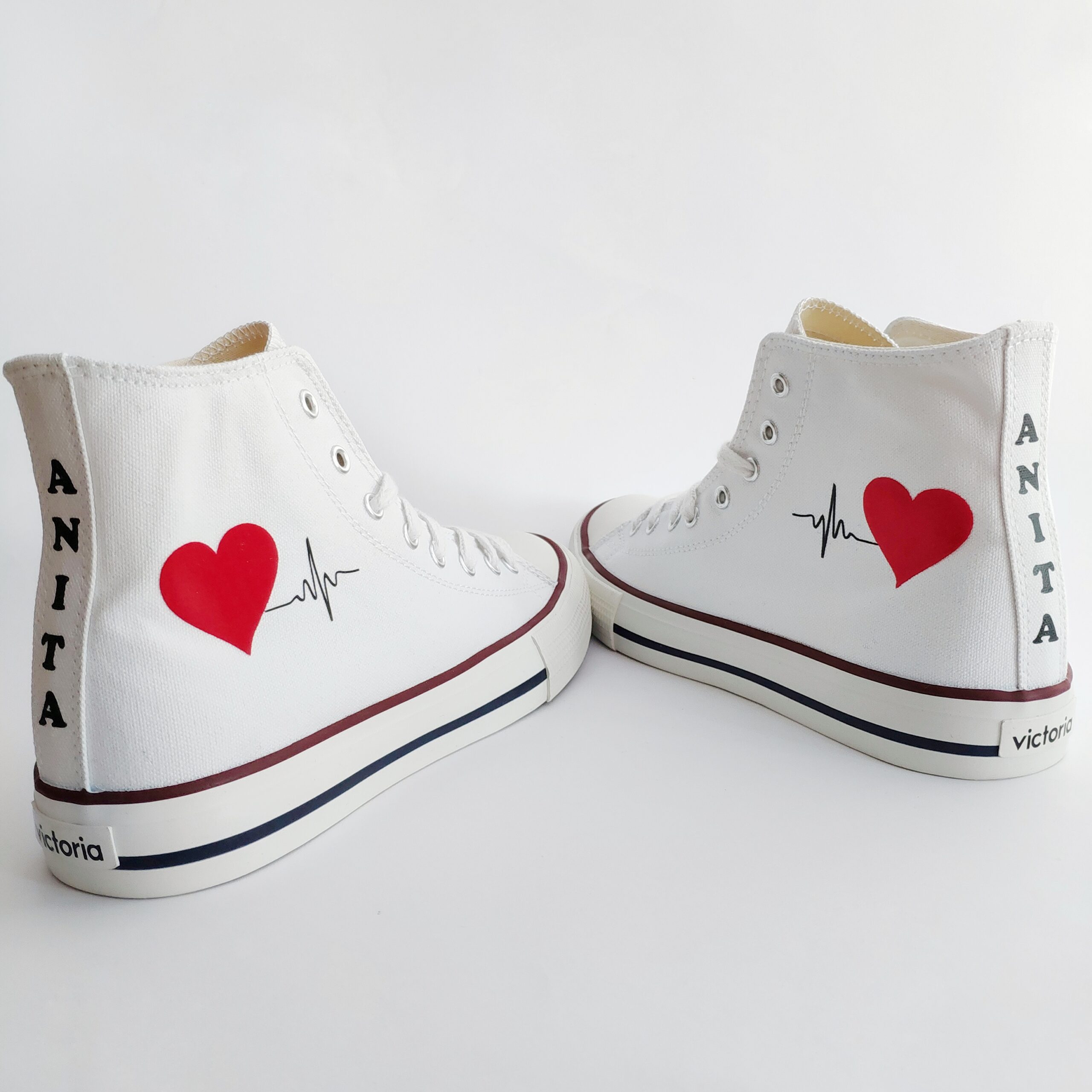 Las zapatillas personalizadas electrocardiograma son zapatillas con bota de plataforma de la marca Victoria en lona blanca personalizadas con un corazón en terciopelo rojo y el dibujo de un electrocardiograma en color negro, todo ello hecho en vinilo térmico resistente a los lavados.